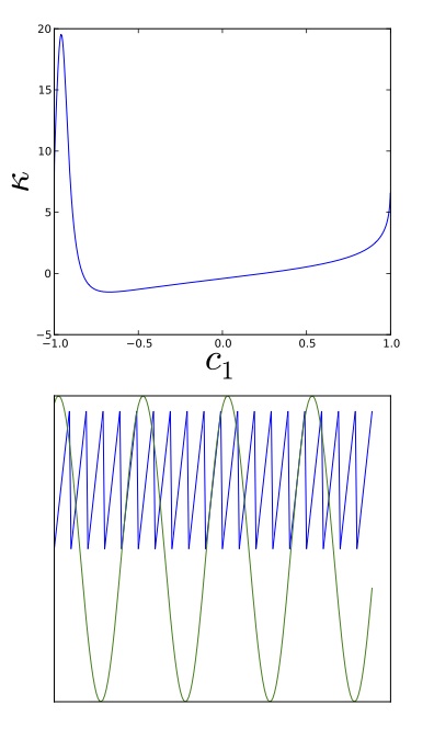 When we applied the code above to the two signals shown in the introduction, we obtained the top plot at right. This shows the kurtosis of \(s\) as a function of \(c_1\), the weight applied to signal \(m_1\). Notice that there are two internal extrema in this plot: a peak near \(-0.9\) and a local minimum near \(-0.7\). These are the two \(c_1\) weight choices that ICA suggests may relate to the pure, underlying signals we seek. To plot each of these signals, we used code similar to the following (the code shown is just for the maximum)