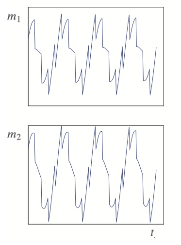 Here, we stress that the \(a_i\) coefficients in (\ref{1}) are hidden from us: We only have access to the \(m_i\). Hypothetical illustrations are given in the figure below. Given only these mixed signals, we'd like to recover the underlying \(c_i\) used to construct them (spoiler: a sine wave and a saw-tooth function were used for this figure).