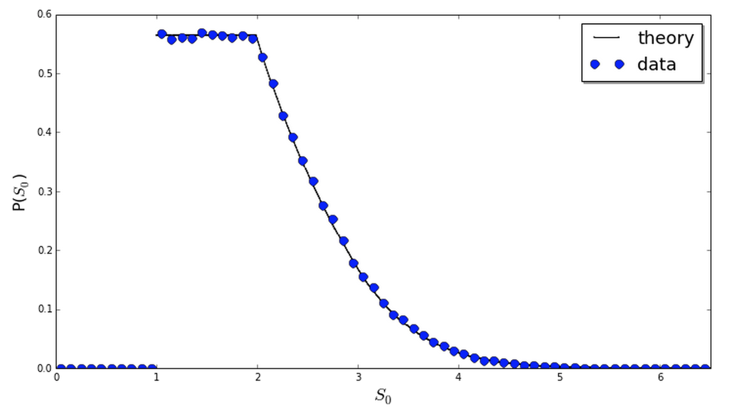 In practice, to find \(J\) one can solve (\ref{delay}) numerically, requiring \(P(S)\) to be normalized. The figure below compares the result to a simulation estimate, obtained via binning the results of 250,000 random sums of form (\ref{problem}). The two agree nicely.